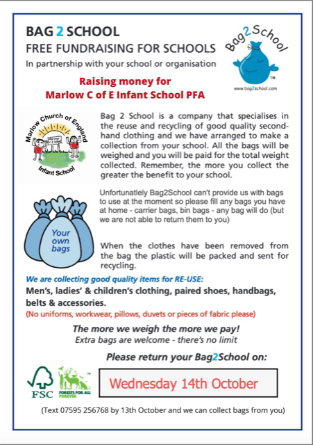 The first Bag2School of the year is next Wednesday, 14th October. Drop off points will be by the school gates but if you need a hand with getting anything to school then drop us a message via the PFA email and we can come and collect from you. Feel free to mention this to friends, family and your neighbours too!