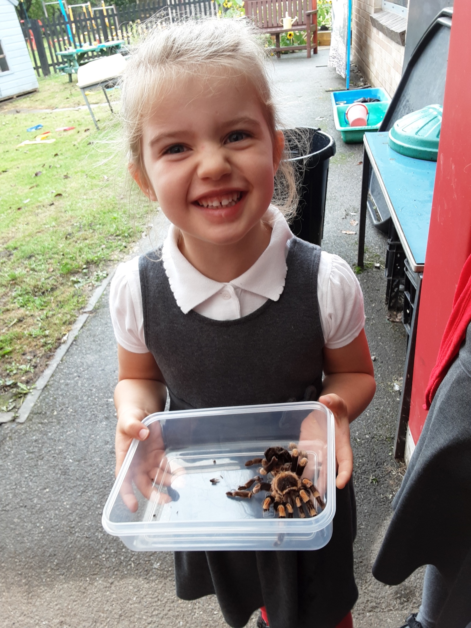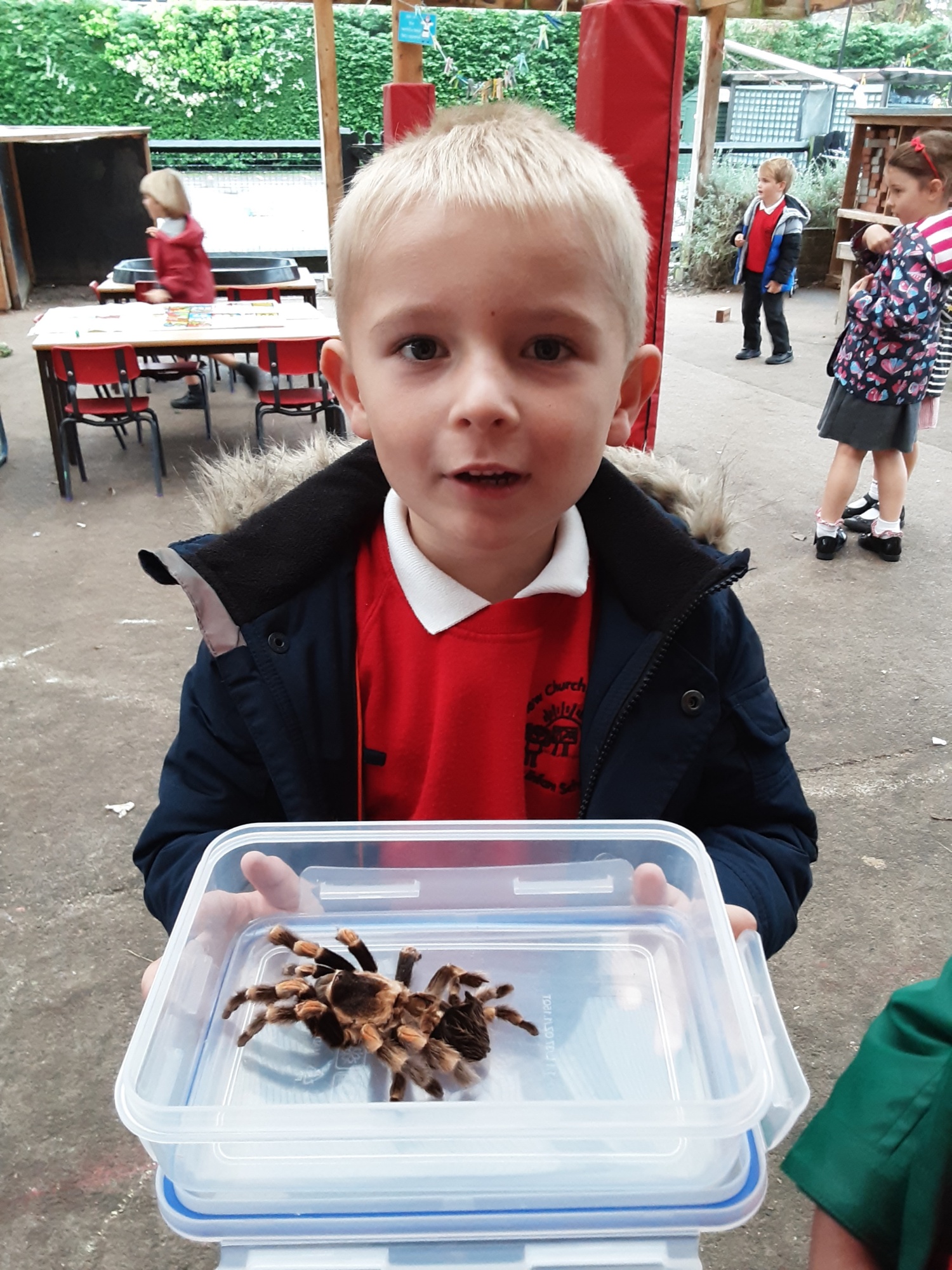 The children in Reception are looking at the nursery rhymes Incy-Wincy Spider and Little Miss Muffett and this week came face to face with the star of those rhymes (well, almost).
